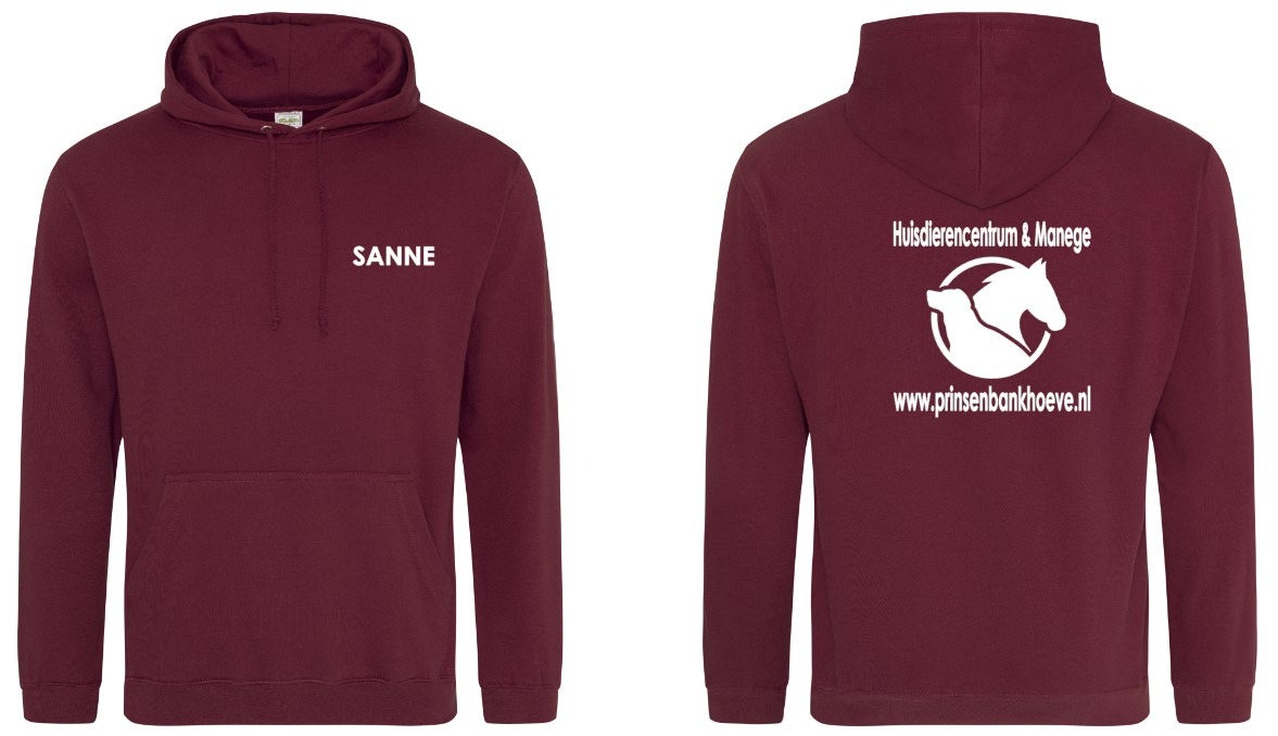 Leuke hoodie met opdruk naam voorzijde borst (Optioneel) en logo Prinsenbankhoeve groot op de achterzijde in wit.